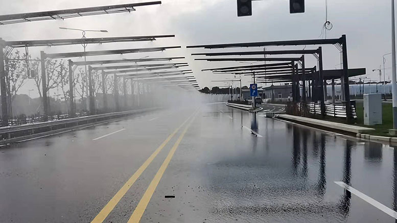 在智能汽車的研發(fā)過程中,考慮到公共交通復雜程度的影響,需要在汽車試驗場 設置各種交通模擬場景,使智能汽車在模擬的場景中進行各項性能測試,驗證智能汽車的 智能性、穩(wěn)定性和安全性。其中,雨霧天氣是交通模擬場景中的一項重要環(huán)境場景,雨霧天 氣能大大降低道路的能見度,每年都存在因大霧、團霧等天氣而發(fā)生的交通事故,給汽車、 行人的出行帶來較大的安全隱患。